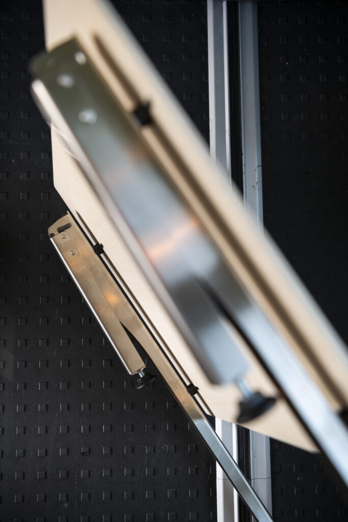 Die Schienen bestehen aus zwei maßgefertigten Edelstahlteilen die mit handgedrehten Bolzen miteinander befestigt sind. Das Holz ist unbehandelt. Alle Einzelteile werden regional und nachhaltig gefertigt, auf Plastik und Lacke wird verzichtet.